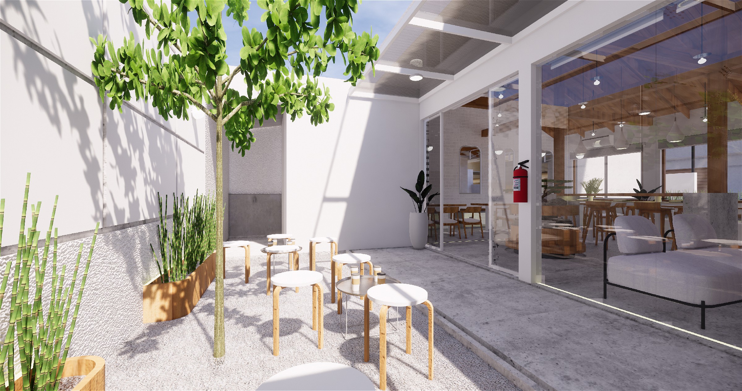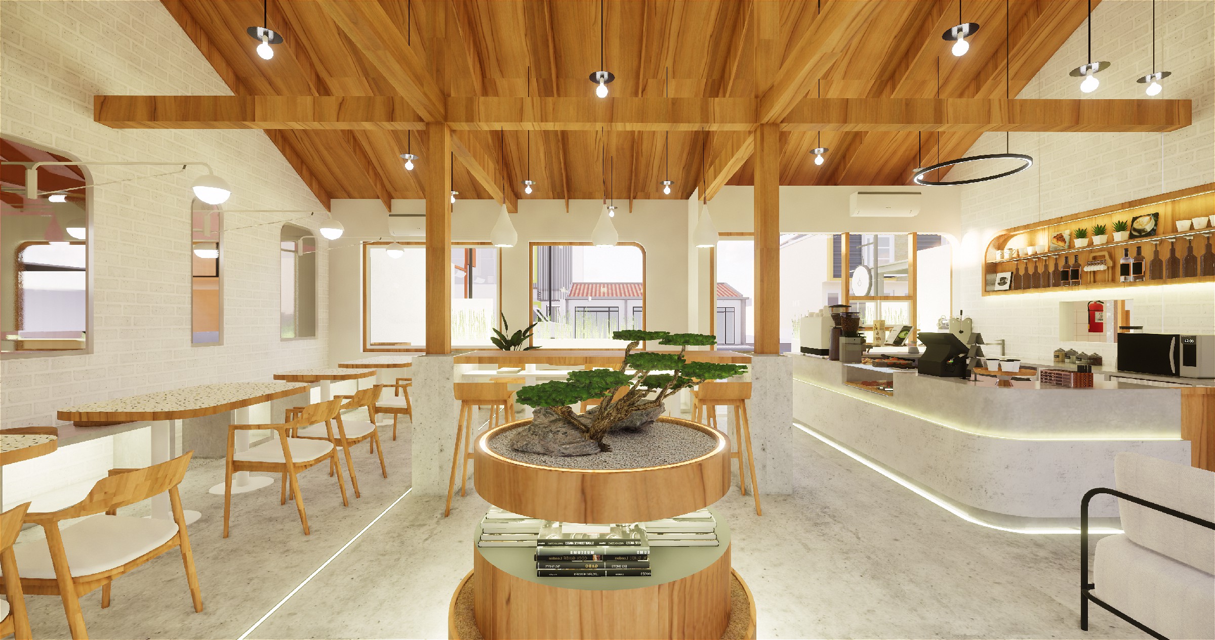 This Japandi-inspired urban coffee shop and eatery reimagines the café experience, seamlessly blending Japanese simplicity with Scandinavian warmth to create an inviting space that celebrates both craftsmanship and culinary artistry. Designed as a gourmet destination specializing in artisanal bread, the layout integrates three distinct yet interconnected zones-a lush front garden, a cozy indoor café and eatery, and an intimate backyard garden, all fostering an interactive dining atmosphere. Every space is intentionally crafted to offer a harmonious balance between comfort and engagement, ensuring guests feel immersed in both nature and urban sophistication. The architectural and interior expression is anchored in natural white and wood tones, reinforcing the Japandi aesthetic through clean lines, organic textures, and a minimalist color palette. Thoughtfully designed custom furniture, accessories, and curated features elevate the experience, ensuring a unique yet familiar ambiance tailored to Gen Z and millennial generations who seek authenticity, social interaction, and aesthetic appeal in their dining experiences. Whether enjoying a coffee in the garden, indulging in gourmet bread indoors, or unwinding in the tranquil backyard space, this eatery embodies modern simplicity and cultural fusion, making it a standout urban retreat.