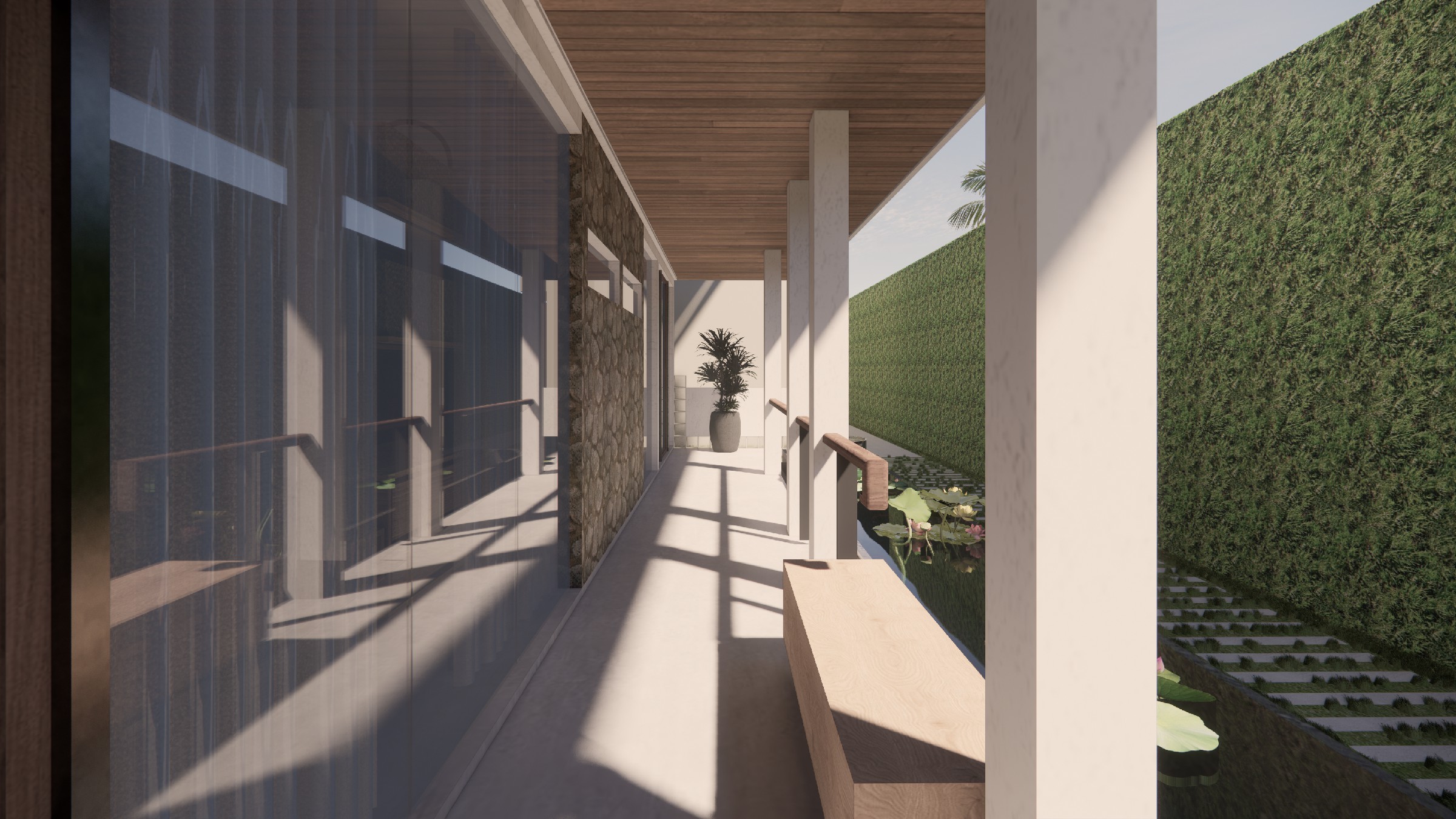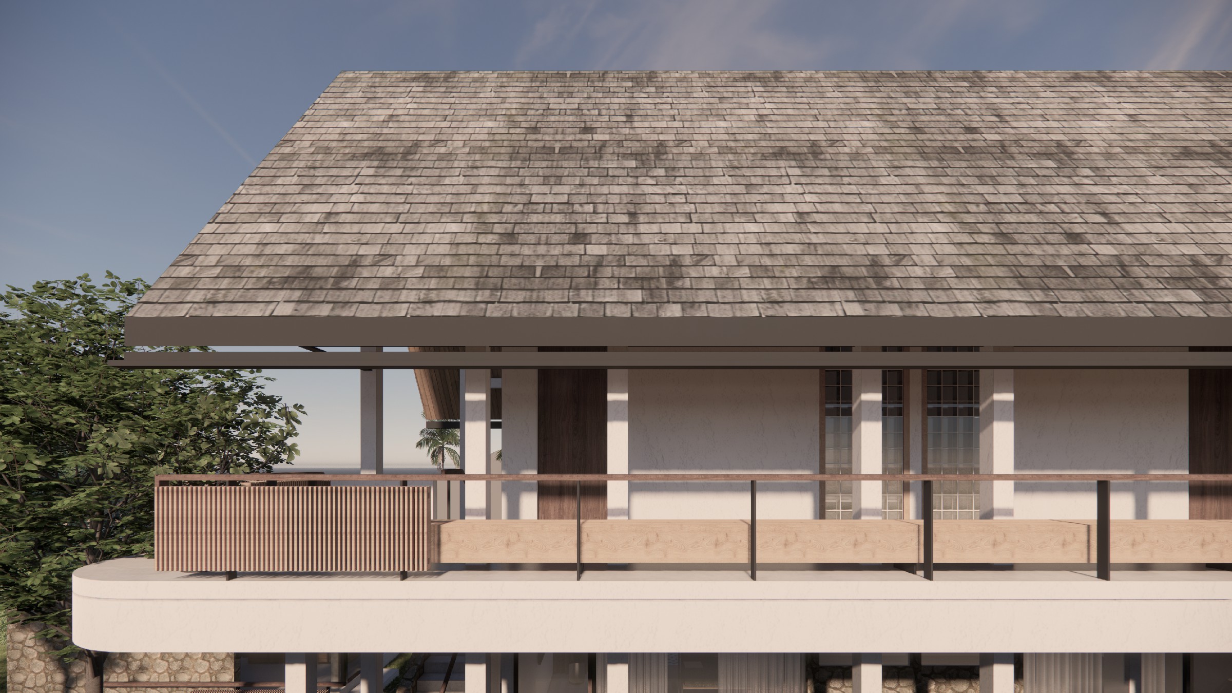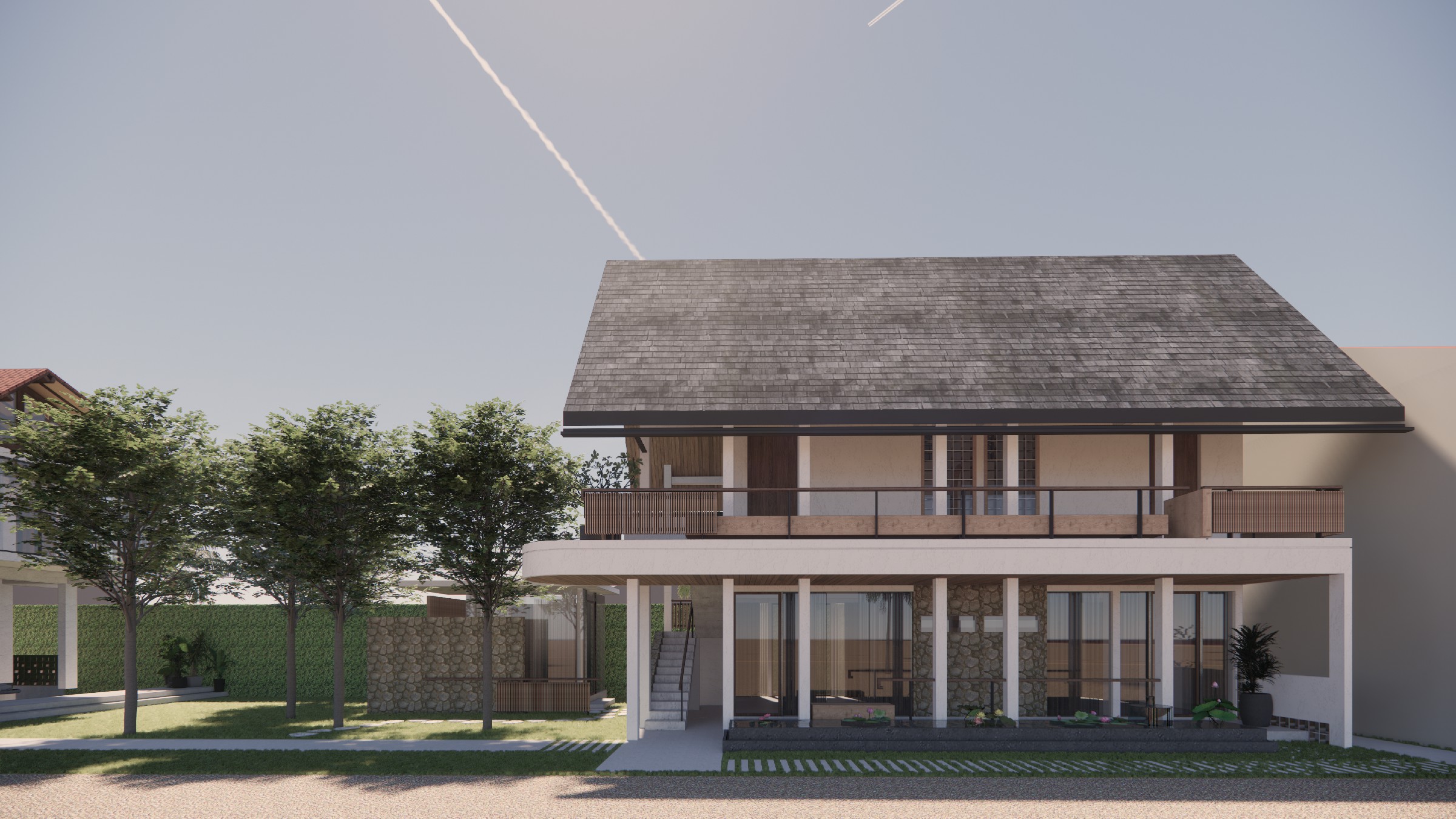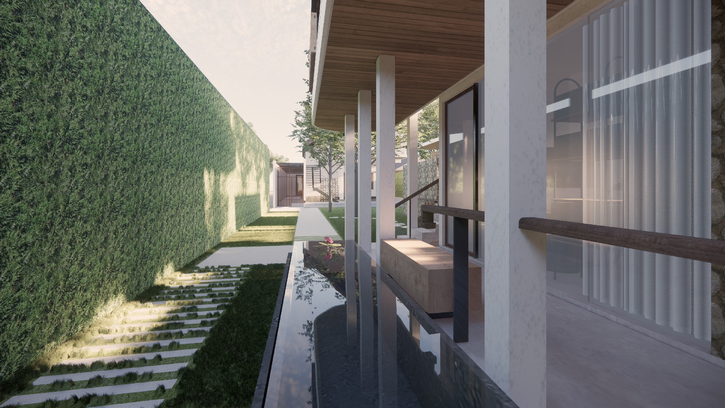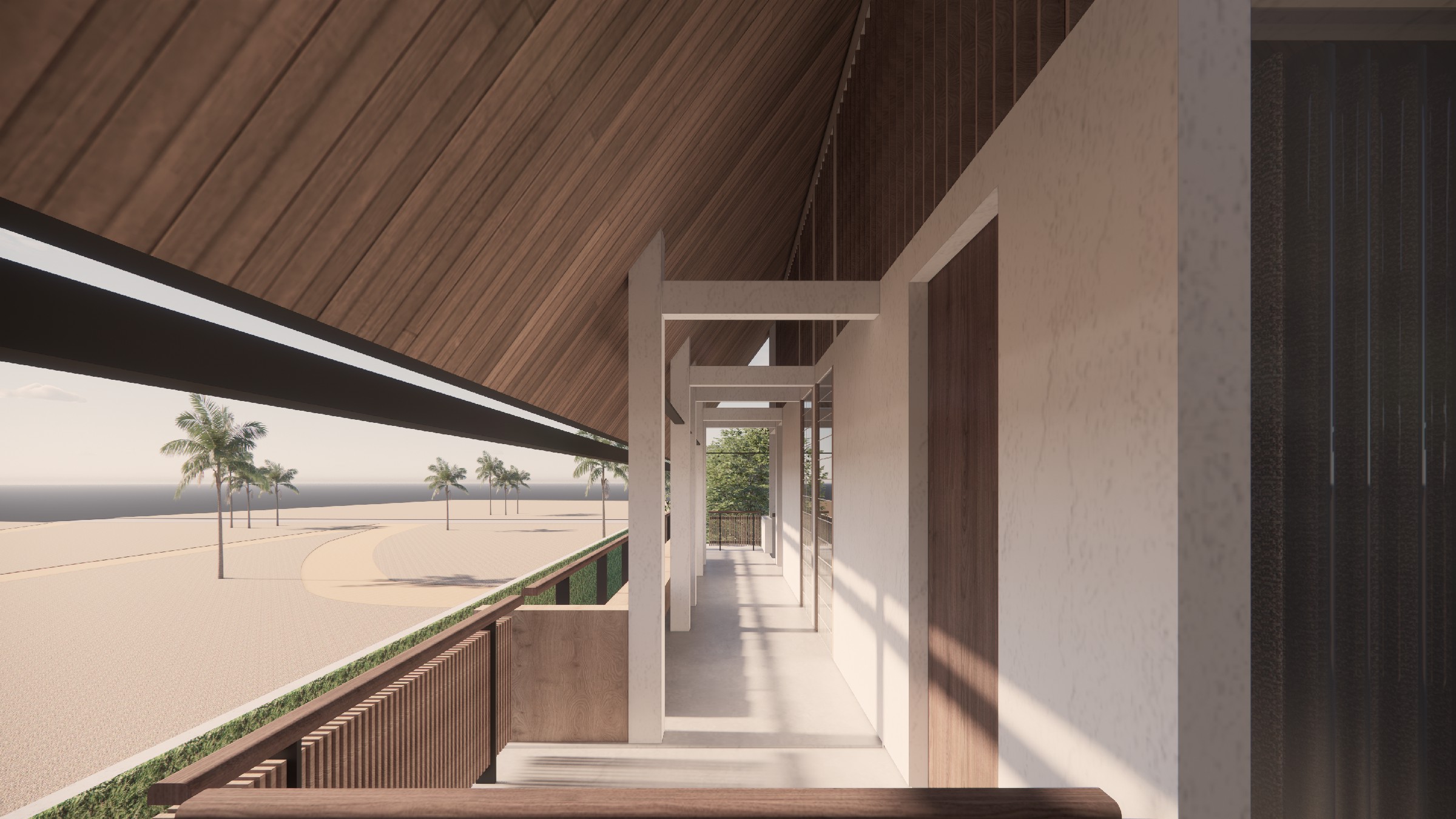 This exclusive two-storey villa, strategically positioned within a larger seaside complex, offers a seamless balance between luxury, nature, and hospitality. Designed with an emphasis on outdoor connectivity, the architectural form integrates an expansive corridor terrace and an artistic outdoor staircase, transforming circulation spaces into statement design elements. The ground floor houses two deluxe rooms, each opening onto a tranquil back garden, while the upper floor features two suite rooms, complete with private balconies that extend the living experience into the tropical surroundings. Every room is designed with privacy in mind, featuring individual bathrooms and wardrobes, ensuring comfort and exclusivity. A defining feature of the villa is the reflecting pond, serving both as a visual centerpiece and a functional microclimate enhancer, contributing to passive cooling and a serene ambiance. Complementing the residential experience, the outdoor bakery, strategically placed within the landscape, provides a charming, service-oriented hub for the entire villa complex, supporting guests with fresh culinary delights. The villa itself is merely one piece of a larger, interconnected retreat, extending from the main road to the seaside, leveraging its strategic location for accessibility and natural immersion. Strong greenery integration plays a key role in transitions between spaces, reinforcing the organic atmosphere while enhancing the sensory experience of the landscape. This design vision creates a luxurious yet grounded retreat, where architecture, nature, and hospitality harmonize effortlessly.