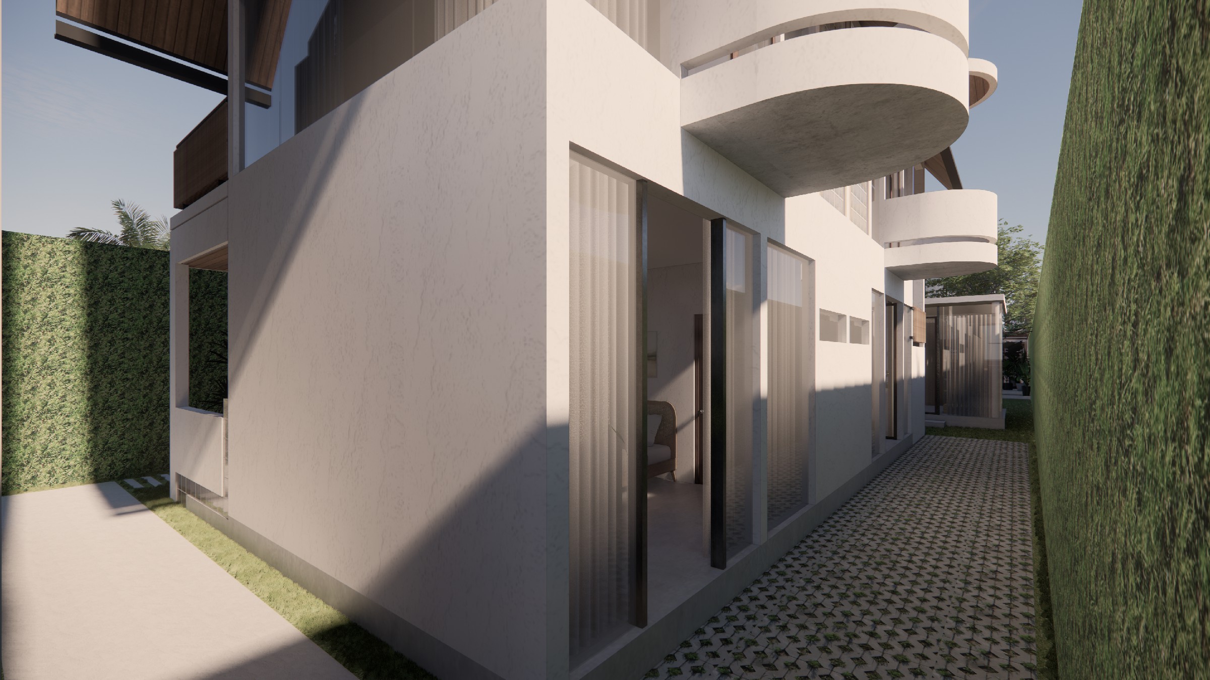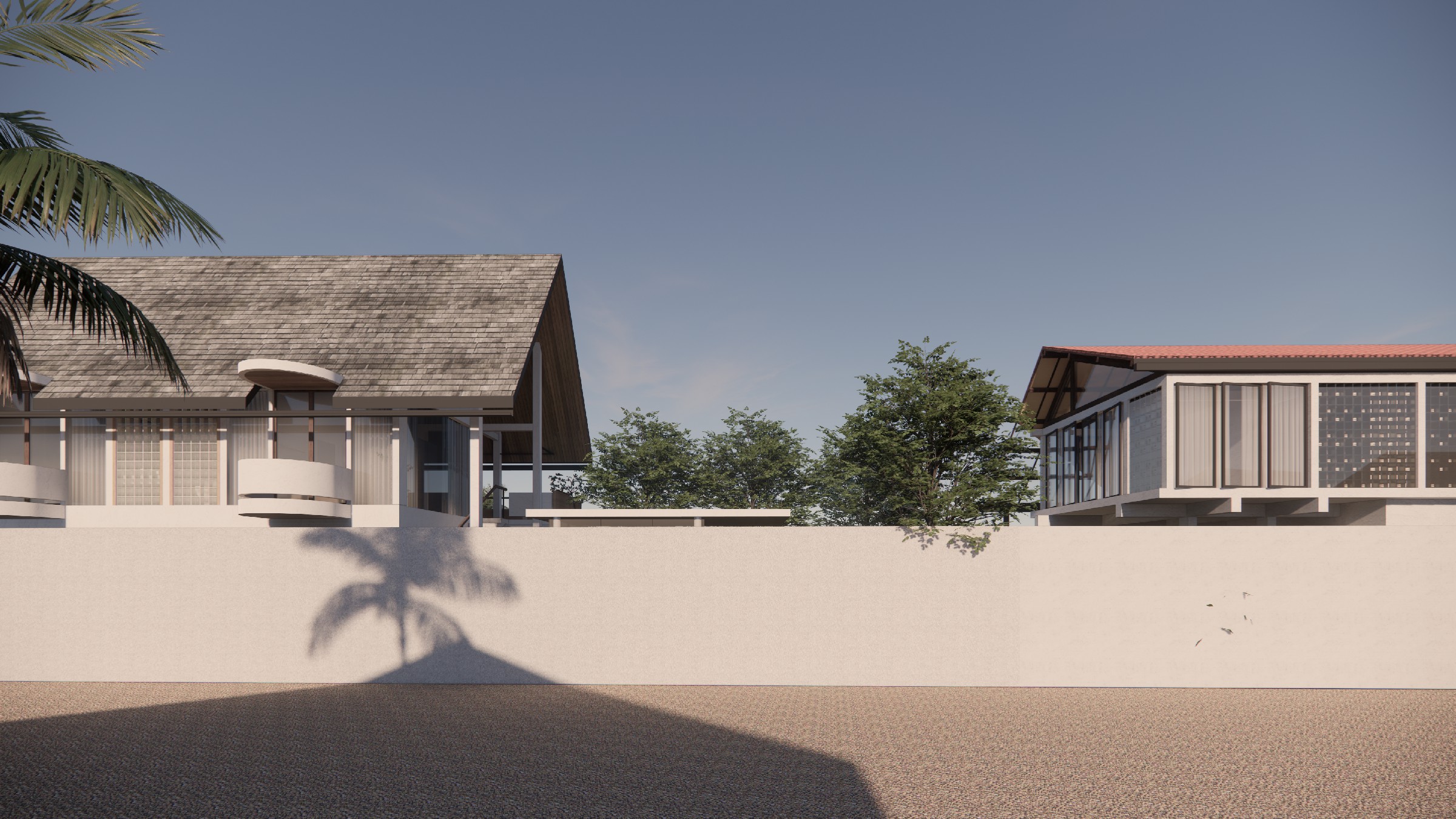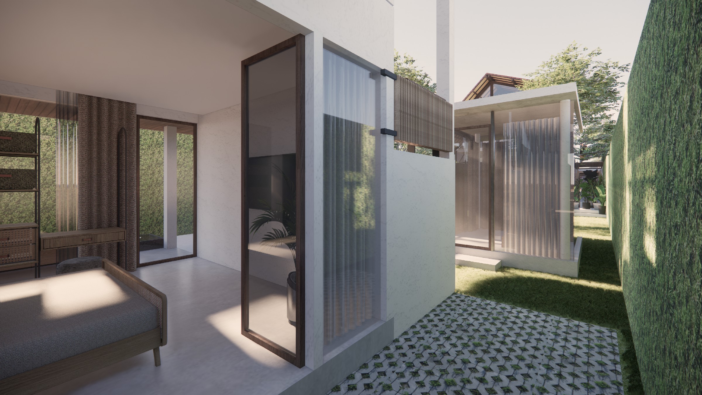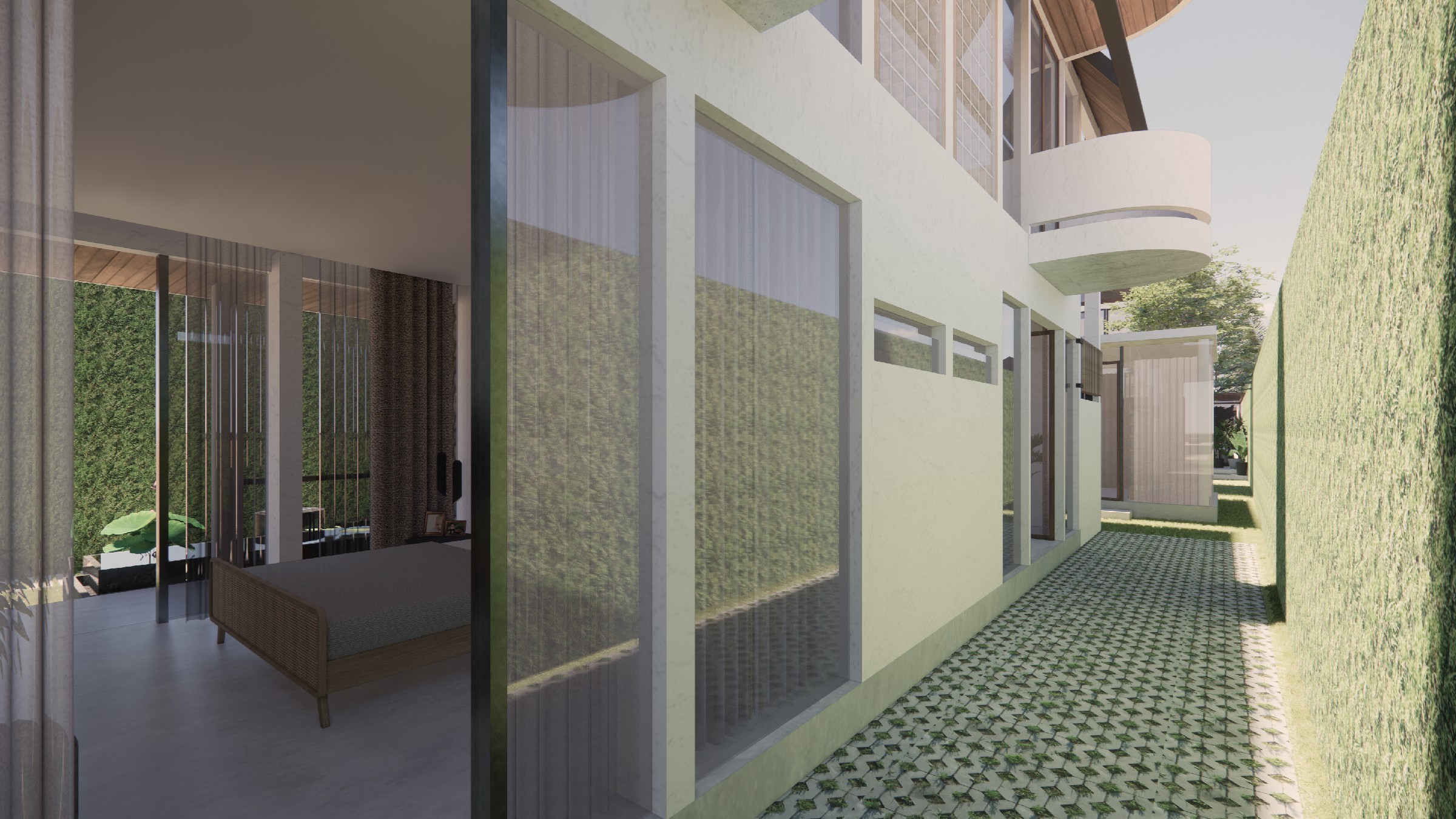 This exclusive two-storey villa, strategically positioned within a larger seaside complex, offers a seamless balance between luxury, nature, and hospitality. Designed with an emphasis on outdoor connectivity, the architectural form integrates an expansive corridor terrace and an artistic outdoor staircase, transforming circulation spaces into statement design elements. The ground floor houses two deluxe rooms, each opening onto a tranquil back garden, while the upper floor features two suite rooms, complete with private balconies that extend the living experience into the tropical surroundings. Every room is designed with privacy in mind, featuring individual bathrooms and wardrobes, ensuring comfort and exclusivity. A defining feature of the villa is the reflecting pond, serving both as a visual centerpiece and a functional microclimate enhancer, contributing to passive cooling and a serene ambiance. Complementing the residential experience, the outdoor bakery, strategically placed within the landscape, provides a charming, service-oriented hub for the entire villa complex, supporting guests with fresh culinary delights. The villa itself is merely one piece of a larger, interconnected retreat, extending from the main road to the seaside, leveraging its strategic location for accessibility and natural immersion. Strong greenery integration plays a key role in transitions between spaces, reinforcing the organic atmosphere while enhancing the sensory experience of the landscape. This design vision creates a luxurious yet grounded retreat, where architecture, nature, and hospitality harmonize effortlessly.