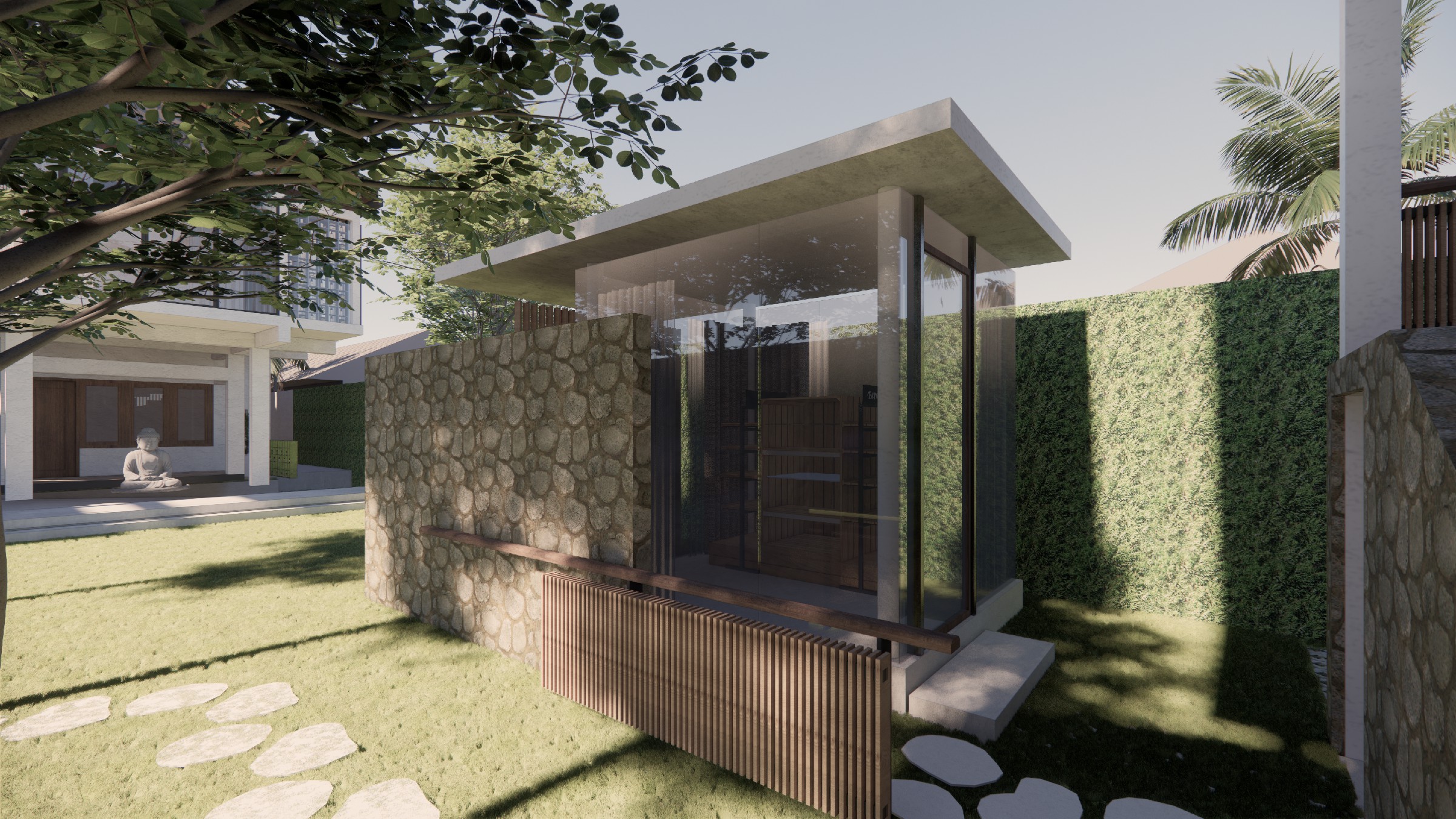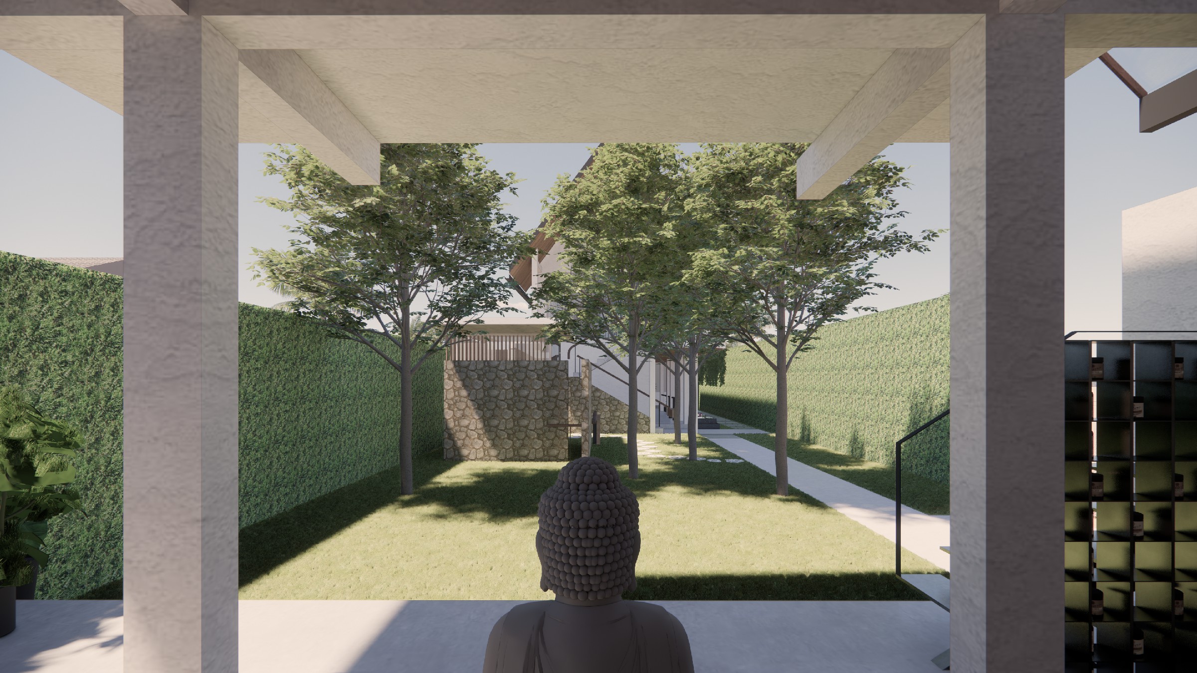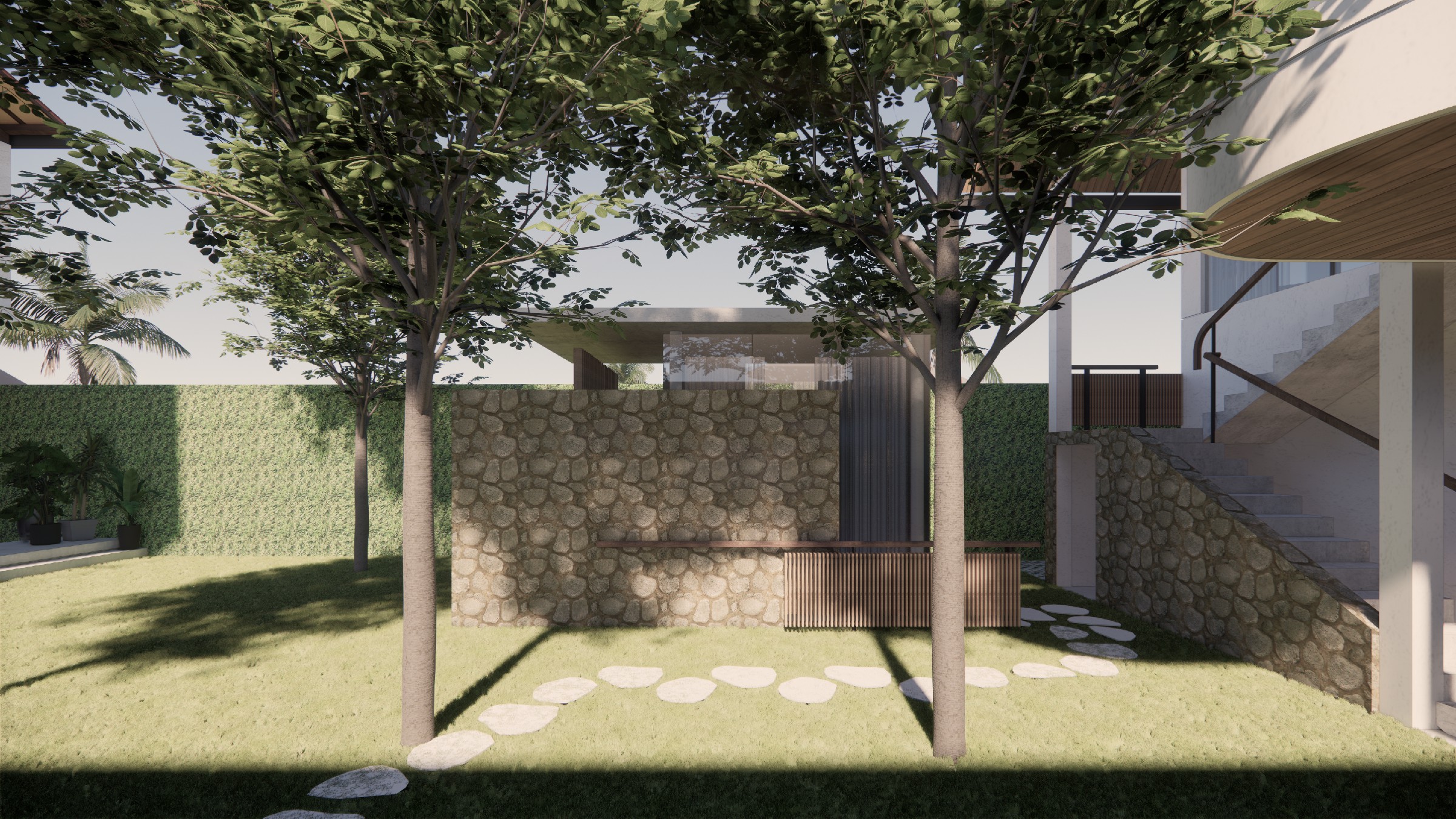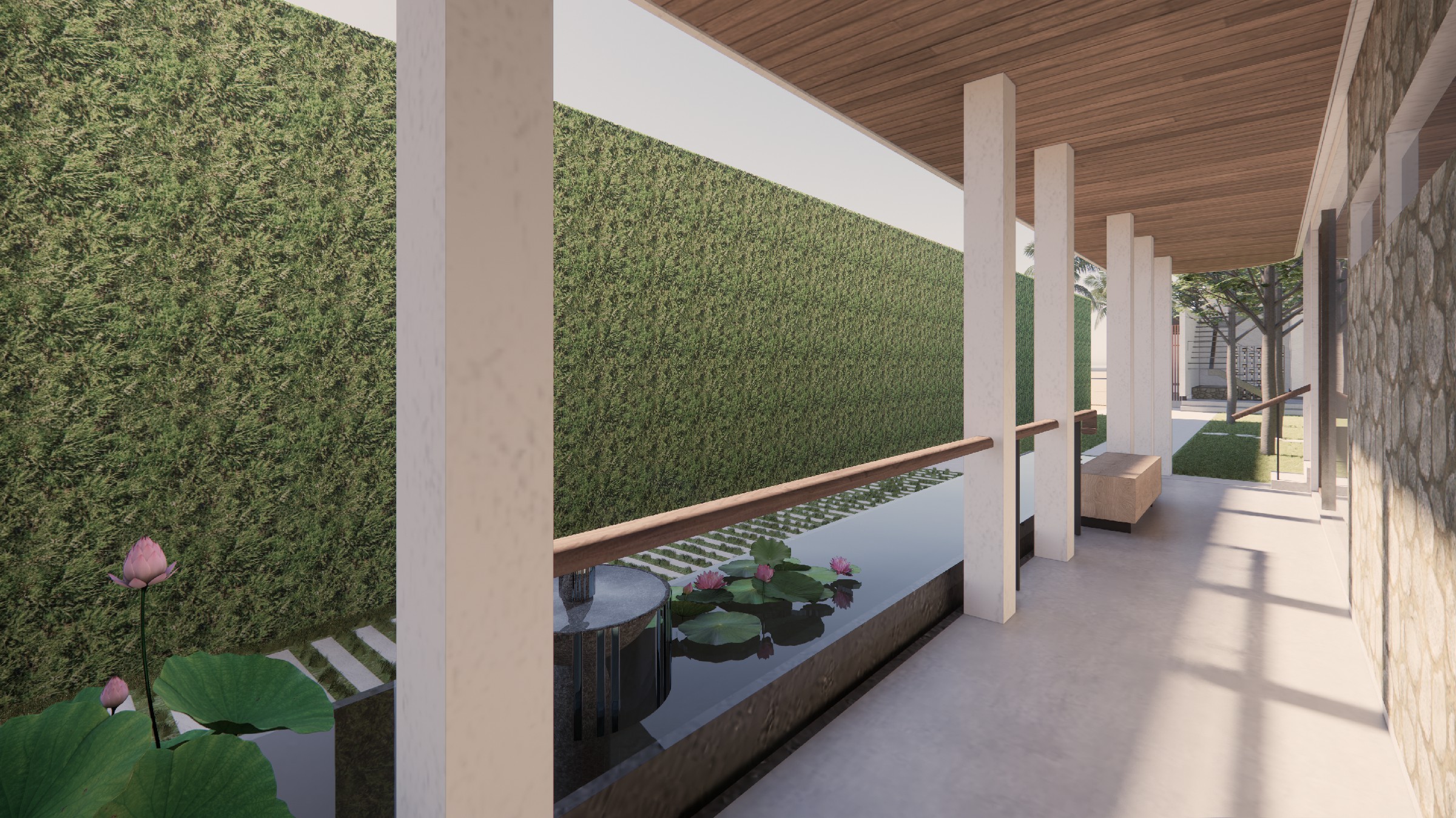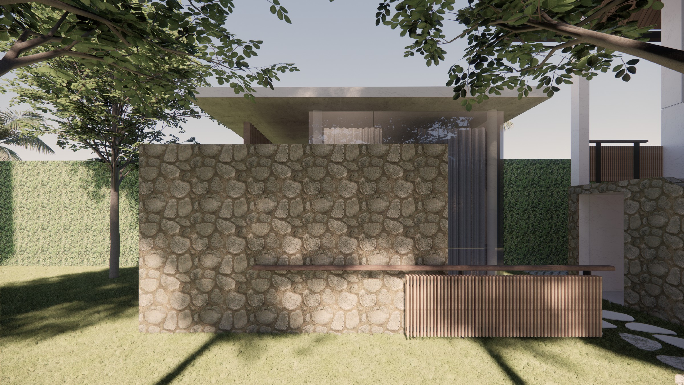This exclusive two-storey villa, strategically positioned within a larger seaside complex, offers a seamless balance between luxury, nature, and hospitality. Designed with an emphasis on outdoor connectivity, the architectural form integrates an expansive corridor terrace and an artistic outdoor staircase, transforming circulation spaces into statement design elements. The ground floor houses two deluxe rooms, each opening onto a tranquil back garden, while the upper floor features two suite rooms, complete with private balconies that extend the living experience into the tropical surroundings. Every room is designed with privacy in mind, featuring individual bathrooms and wardrobes, ensuring comfort and exclusivity. A defining feature of the villa is the reflecting pond, serving both as a visual centerpiece and a functional microclimate enhancer, contributing to passive cooling and a serene ambiance. Complementing the residential experience, the outdoor bakery, strategically placed within the landscape, provides a charming, service-oriented hub for the entire villa complex, supporting guests with fresh culinary delights. The villa itself is merely one piece of a larger, interconnected retreat, extending from the main road to the seaside, leveraging its strategic location for accessibility and natural immersion. Strong greenery integration plays a key role in transitions between spaces, reinforcing the organic atmosphere while enhancing the sensory experience of the landscape. This design vision creates a luxurious yet grounded retreat, where architecture, nature, and hospitality harmonize effortlessly.