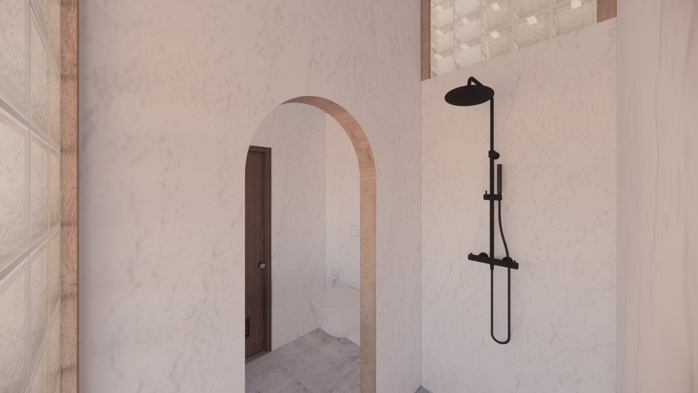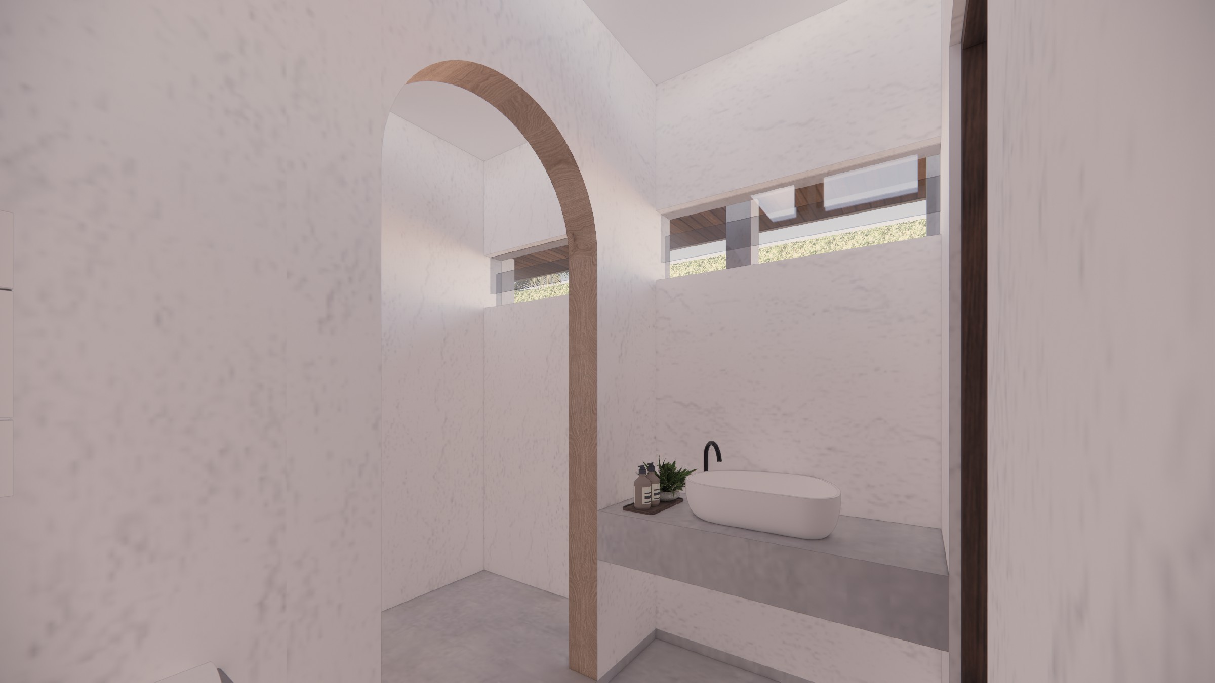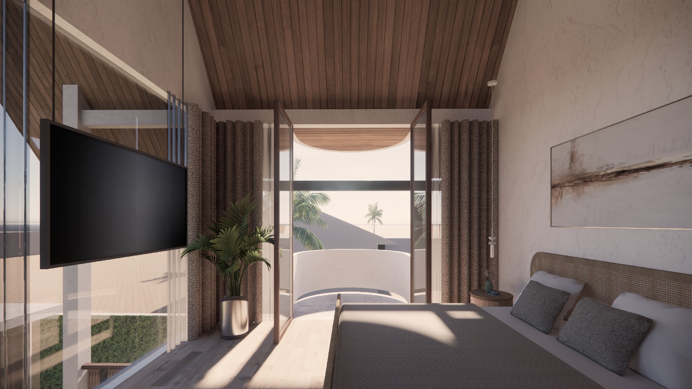 The interior of the Narrow Garden villa exclusively embraces a modern and private hospitality concept, ensuring a seamless blend of comfort and sophistication. Designed with four rooms-two on the lower floor and two suite-style rooms on the upper level-each space is curated for relaxation and refined living. Detached from service areas, the layout prioritizes privacy, allowing guests to experience serenity while still remaining interconnected with the villa’s dynamic architectural elements. Each room features a single double-bed, accompanied by a wardrobe, chair, TV, side table, and a thoughtfully arranged private bathroom equipped with a washbasin, closet, and shower-all designed for optimal spatial efficiency. Floor-to-ceiling glazing enhances natural light and panoramic views, while flexible openings facilitate airflow, reinforcing passive cooling strategies. To maximize user comfort, a dual-layer curtain system (solid curtain and vitrase) offers adaptable light control and privacy management. The two upper-floor suites boast luxurious private balconies, framing breathtaking vistas and extending the living experience beyond interior spaces. Every detail, from accessibility to spatial transitions, is designed to ensure effortless movement while preserving individual privacy, crafting an intimate yet sophisticated atmosphere for guests.